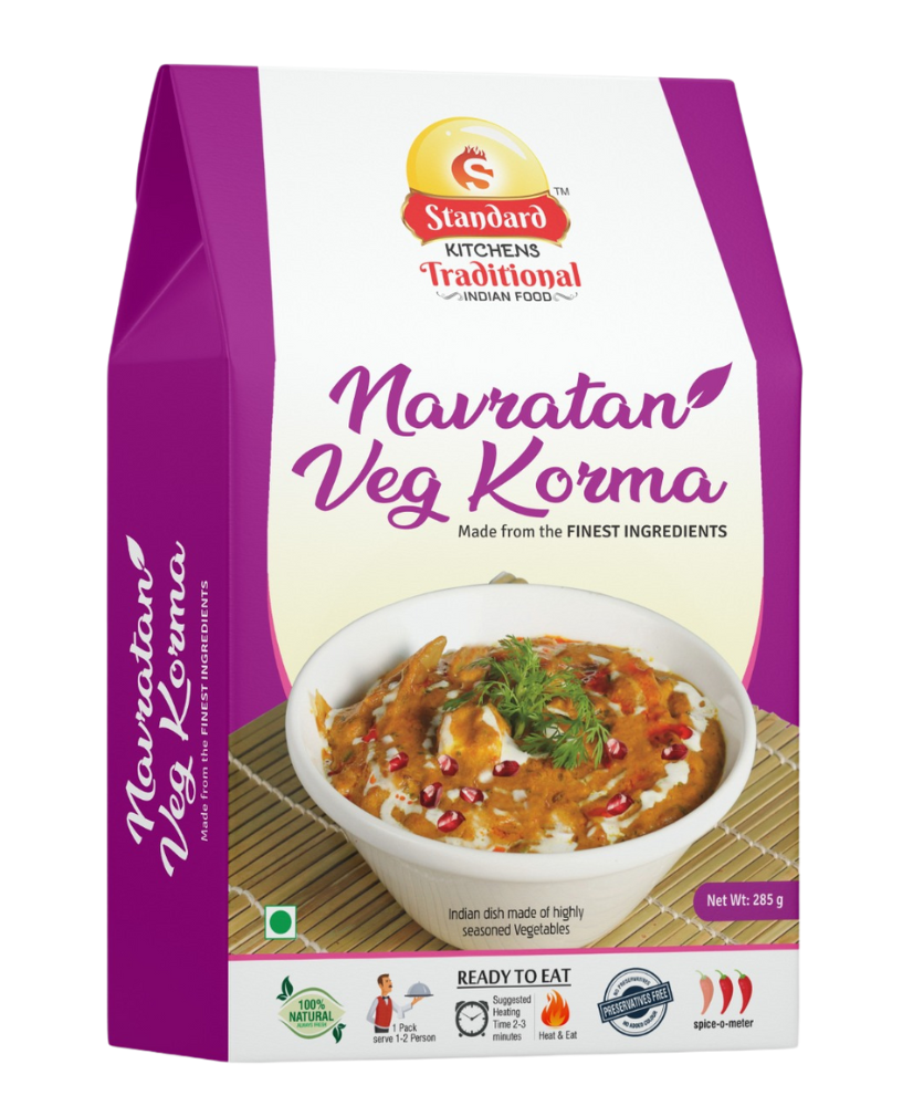 Experience the royal flavors of India with Standard Kitchens Navratan Veg Korma – a creamy, mildly spiced curry made with nine varieties of fresh vegetables, cashews, and aromatic spices. This ready-to-eat dish is crafted from the finest natural ingredients, preservative-free, and ready in just 2–3 minutes. Perfect for quick meals at home, the office, or while traveling.