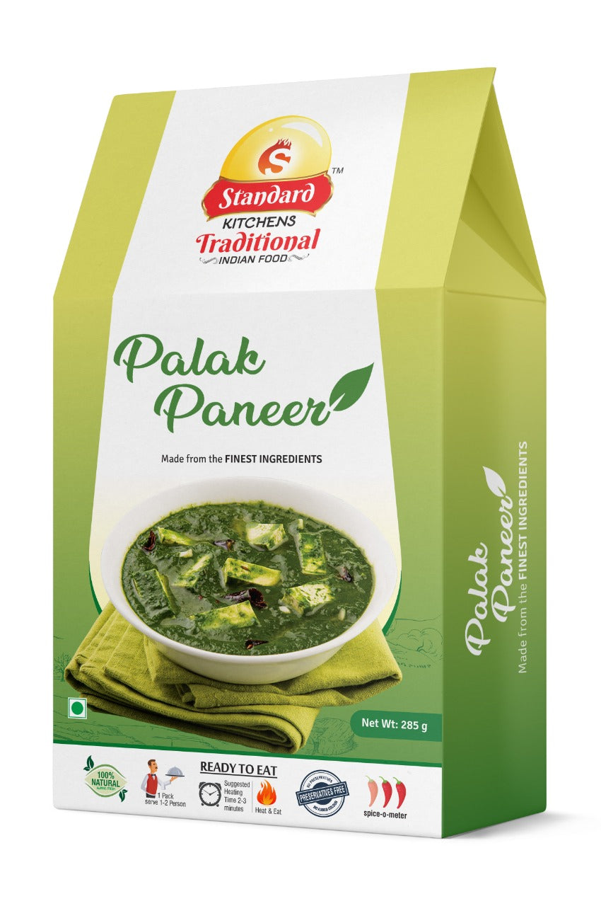 Savor the authentic taste of North India with Standard Kitchens Palak Paneer – tender cubes of paneer simmered in a smooth, spiced spinach gravy. Made from the finest natural ingredients, this ready-to-eat meal is preservative-free, rich in flavor, and ready in just 2–3 minutes. Perfect for a quick lunch, dinner, or travel meal.